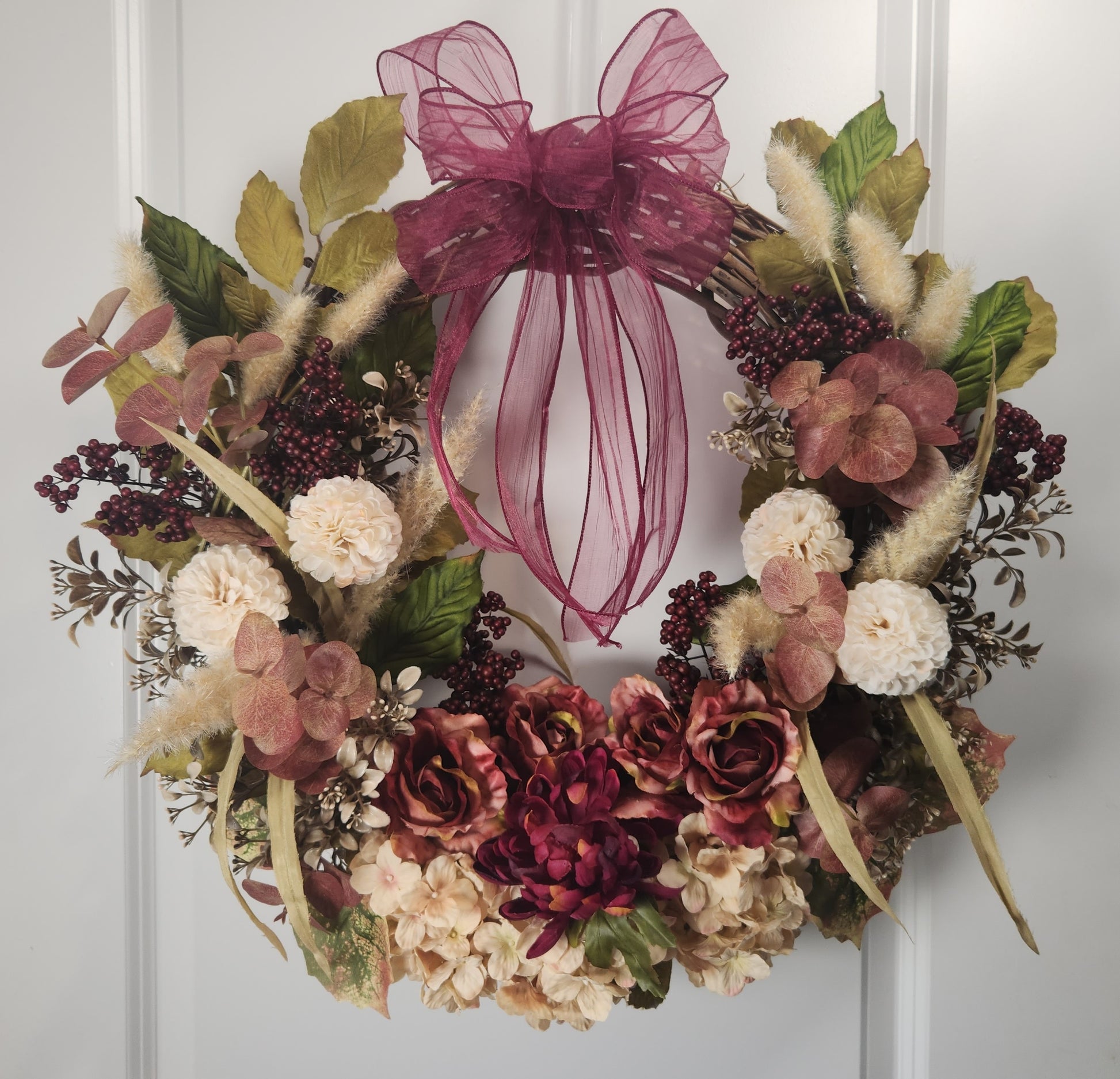 Burgandy roses, blush hydrangea, cream mums, fall berries and wheat accented with fall greenery on an 18-inch grapevine base. Finished arrangement measures 24"x24".